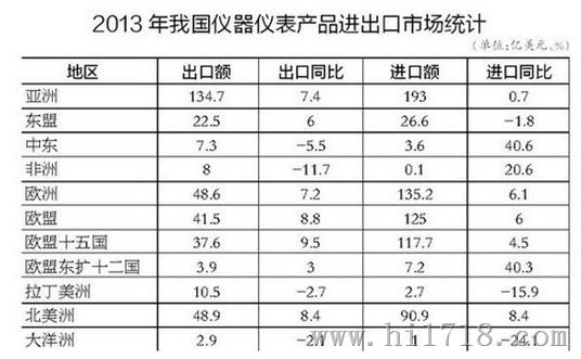2013年国家仪器仪表产品进口大于出口2014-03-04 09:21 近日,网上流传着一份2013年我国仪器仪表产品进出口市场统计数据,根据数据显示,我国2013年仪器仪表产品进口大于出口。 从数据来看,2013年我国仪器仪表产品出口额约366.4亿美元,进口额则是达到了703亿美元,可见我国仪器仪表行业与国外的差距较大,有许多产品都是从国外引进的。 具体从地区来看,2013年我国仪器仪表进口额和出口额最大的地区是亚洲,分别达到了134.7亿美元和193亿美元。出口额最小的是大洋洲,为2.9亿美元,而进口额最小的则是非洲,为0.1亿美元。